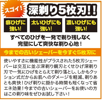 今、最新のひげそりといえば深剃りが効いて剃り味抜群の5枚刃シェーバーです。でもただ剃れるだけじゃなく剃った後もお肌ツルツル、快感といえるほど大満足!そして水洗いができてお手入れも簡単!いつでも気持ちよく使える、その名もダンディシェーバー!今回は新発売を記念して先ず替え刃を1個お付けして更に旅先や車の中でもサッと出してすぐに使える充電式のハンディシェーバーまでお付けした上、更にかんたんに充電できるACアダプタもお付けしたナント!豪華4点セットをわずか10,000円のオドロキ価格にてご提供します。シェーバーの色はブラックかホワイトからお選びください。