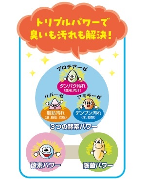 服についたシミや汚れ、水回りのヌメリや黒カビなど手強い汚れ落としにおすすめしたいのが「トリプルパワーマルチ洗浄剤」です。タンパク汚れ、皮脂汚れ、でんぷん汚れに対応した3種類の「酵素」と「酸素」「除菌剤」のトリプルパワーで洗浄、除菌、漂白!お洗濯にはもちろん、嫌な部屋干し臭対策にも効果を発揮します。酸素系漂白剤なので、色柄ものにも使えます。頑固な汚れにはつけおきが最適。お風呂のカビやヌメリ、キッチンのまな板や調理器具の油汚れ、リビングやトイレ掃除他、配管の詰まりや洗濯槽の洗浄など、アイデア次第で使い方いろいろ。