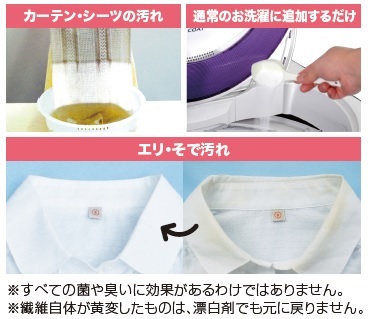 ●セット内容=酵素系洗浄漂白剤800g×4袋、専用スプーン、取扱説明書●材質:界面活性剤、過炭酸ナトリウム、炭酸塩、水質軟化剤、酵素、除菌剤、他●サイズ:重さ=(1個)縦18×高さ290×横85mm/800g●日本製