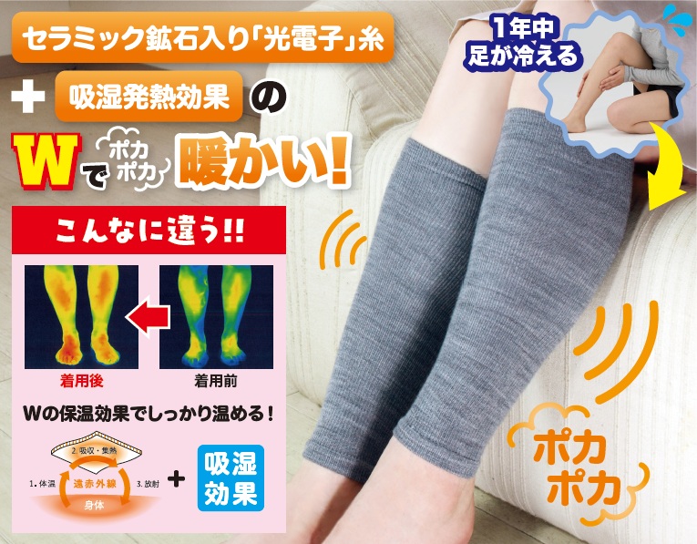 「寒い時に足が冷えてツライ」「夏の冷房で下半身が冷えて」…そんな方にお勧めなのが、3大効果で足をポカポカ温める「光電子繊維で暖か!ふくらはぎサポーター」です。1つめは、体温を反射して逃がさないセラミック繊維を練りこんだ「光電子繊繊維」と吸湿発熱効果をプラスしたW効果で、ふくらはぎをポカポカに温めます。2つめはふくらはぎをしっかり温めることで全身の血流が良くなるため、むくみや疲れが気になる方におすすめです。そして3つめは着圧を細かく変えたストレッチ効果で筋肉を刺激。履くだけでふくらはぎがすっきり見え、外出が楽しくなります。この3つの効果で寒い冬はもちろん、冷房の冷えがツライ夏も大活躍!今回は、洗い換えに便利な8枚組でご用意しましたので、一年中ポカポカの暖かさを手に入れてください。