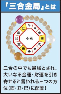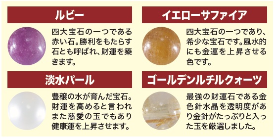 誰もが望む金運と財運の上昇を強力に祈願できるブレスレットをご紹介します。四大宝石にも数えられる「ルビー」と「(イエロー)サファイア」の大珠を用いた、宝飾品としても価値ある逸品です。多くの女性が憧れ、所有者に富と力を与えると言われる「ルビー」、サファイアの中でも金運の証とされる「イエローサファイア」、さらに、財運を高めると言われる「淡水パール」の大珠を、風水最強の卦と言われる「三合金局」の位置に配置。3つの貴石のパワーと風水の力により、金運財運上昇をご祈念いただけます。周りを飾る貴石は最強の財運石と言われる「金針水晶」を使用。宝飾品としての価値を証明する「鑑別書」とともに「桐箱入り」でお届けします。一生ものの逸品をぜひ手になさって、金運財運の上昇をご祈願ください。