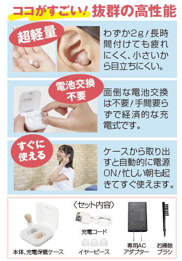 電池交換不要!自然に聴こえるデジタル補聴器(1個)