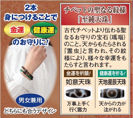 数千年前から古代チベットで「神秘の霊石」と言われ、家宝として大切に受け継がれている「至純天珠」は、描かれたその紋様により様々な幸運をもたらすと言われています。この至純天珠を用いて人生に欠かせない「金運」「健康運」を祈願する2本のブレスレットをご用意しました!「万事が上手く運ぶ霊力を持つ」と言われる「如意天珠」を用いた「金運祈願!如意天珠ブレスレット」と、「天からの力で運気を高める」と言われる「天地星辰天珠」を配した「健康運祈願!天地星辰天珠ブレスレット」の2本組。肌身離さず身に付けることで、日々の金運・健康運の上昇をご祈願いただけます。また、チベットでは古くから「招財の石」として知られ、健康運の向上の力もあるとされる「天眼石」と、仏具などにも使用されている魔除けの貴石「黒水晶(モリオン)」も使用。さらに、風水で「金運祈願の石」とされる「虎目石」身体を回復させると言われる「緑瑪瑙」も贅沢にあしらわれています。2本とも身につけることで、「金運」「健康運」を同時に祈願できる逸品です。一生モノのお守りとして、ぜひこの機会に手になさってください。