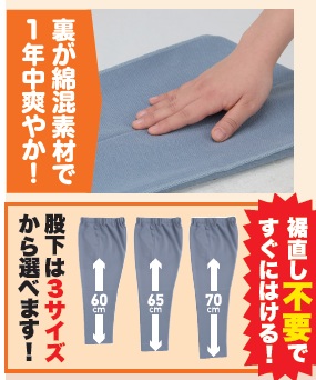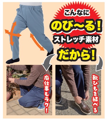 「肌に優しい履き心地のズボンが欲しい…」そんな紳士の皆様にぜひお勧めしたいのが、日本文化センター新登場のこのスラックスです。裏側はサラサラさわやかな綿混素材を使用。肌触りがよく、汗をかいた後のベタツキ感がないため、一年中気持ちよく履いていただけます。しかも、お洒落なデザインでありながら、生地はまるでジャージのように伸縮性抜群!縦横にグーンと伸びますので、はき心地は本当にラク!庭仕事や靴ヒモを結ぶときにしゃがんでも苦しくありません。人気のネイビー、ブラック、グレーを同サイズで各2本ずつ、毎日履ける計6本組で、お値段19,800円でご提供。一年中履けるスラックスが1本あたりなんと3,300円で手にできます!股下も3種類から選べますので、お申込みの際はサイズと股下の長さをご指定ください。