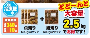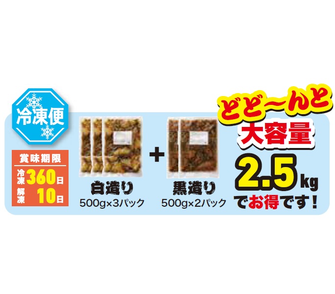 ●セット内容=白造り数の子松前漬け(500g×3パック)、黒造り数の子松前漬け(500g×2パック)のセット合計2.5㎏●原材料 白造り数の子松前漬:数の子(オランダ)、人参、昆布(北海道)、いか加工品(いか、砂糖、食塩)、食塩、かつお節エキス、しょうゆ、砂糖/ソルビット、調味料(アミノ酸等)、酒類、増粘多糖類、(一部に小麦・大豆・いかを含む)黒造り数の子松前漬:数の子(オランダ)、しょうゆ、人参、昆布(北海道)、いか加工品(いか、砂糖、食塩)、かつお節エキス/ソルビット、調味料(アミノ酸等)、酒類、増粘多糖類、(一部に小麦・大豆・いかを含む)●加工地=日本●賞味期限=冷凍:360日 解凍:10日