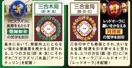 人生で最も大切な「お金」と「健康」を祈願できる「お守りブレスレット」をなんと2本組にしてご用意!2本あわせて身につけることで、一度に「金運」と「健康運」の両方をご祈願いただけるまたとないチャンスです!「金運」「健康運」いずれのブレスレットも、風水最強の方位と言われる「三合」の位置に貴石を配し、強力なパワーを呼び込むと言われる逸品。さらに、主珠には、それぞれ「阿修羅」と「薬師如来」をあらわす梵字を刻印しました。男女兼用デザインで、お守りとしてもご愛用頂けます。風水最強の方位に基づいたブレスレットをぜひ2本とも身につけていただき、「金運」「健康運」2つ同時の運気上昇をご祈念ください。