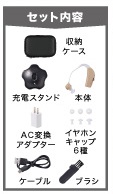 ●セット内容(1個)=充電スタンド、USB充電ケーブル1本、イヤホンキャップ6種、お掃除ブラシ、収納ケース、取扱説明書(CN)、アダプター セット内容は全て各2●サイズ=4.3×1cm 8g●素材=ABS樹脂 他●中国製 ※補聴器ではありません。