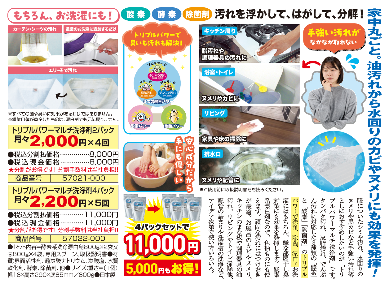 服についたシミや汚れ、水回りのヌメリや黒カビなど手強い汚れ落としにおすすめしたいのが「トリプルパワーマルチ洗浄剤」です。タンパク汚れ、皮脂汚れ、でんぷん汚れに対応した3種類の「酵素」と「酸素」「除菌剤」のトリプルパワーで洗浄、除菌、漂白!お洗濯にはもちろん、嫌な部屋干し臭対策にも効果を発揮します。酸素系漂白剤なので、色柄ものにも使えます。頑固な汚れにはつけおきが最適。お風呂のカビやヌメリ、キッチンのまな板や調理器具の油汚れ、リビングやトイレ掃除他、配管の詰まりや洗濯槽の洗浄など、アイデア次第で使い方いろいろ。