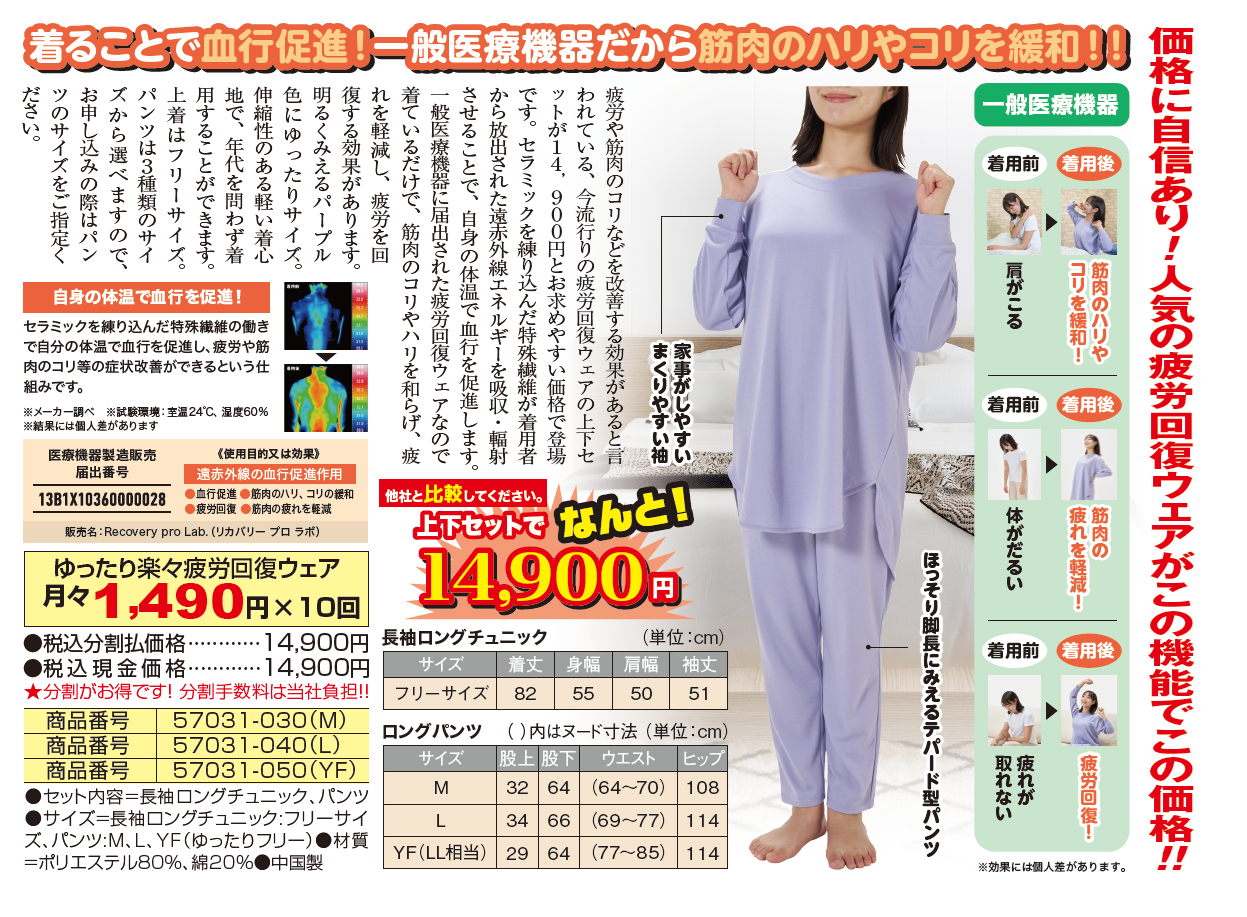 疲労や筋肉のコリなどを改善する効果があると言われている、今流行りの疲労回復ウェアの上下セットが14,900円とお求めやすい価格で登場です。セラミックを練り込んだ特殊繊維が着用者から放出された遠赤外線エネルギーを吸収・輻射させることで、自身の体温で血行を促進します。一般医療機器に届出された疲労回復ウェアなので着ているだけで、筋肉のコリやハリを和らげ、疲れを軽減し、疲労を回復する効果があります。明るくみえるパープル色にゆったりサイズ。伸縮性のある軽い着心地で、年代を問わず着用することができます。上着はフリーサイズ。パンツは3種類のサイズから選べますので、お申し込みの際はパンツのサイズをご指定ください。